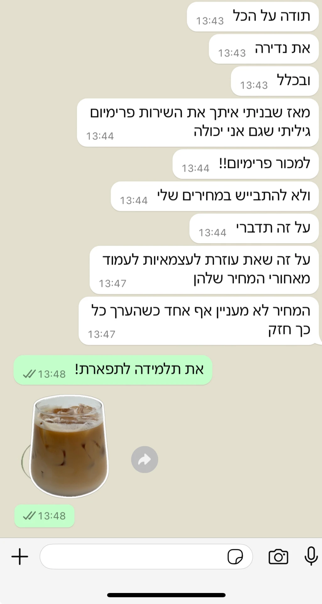 את מקבלת את הוואטסאפ הישיר שלי. אני עונה שם באופן אישי ולא דרך שירות לקוחות או בוט כלשהוא.